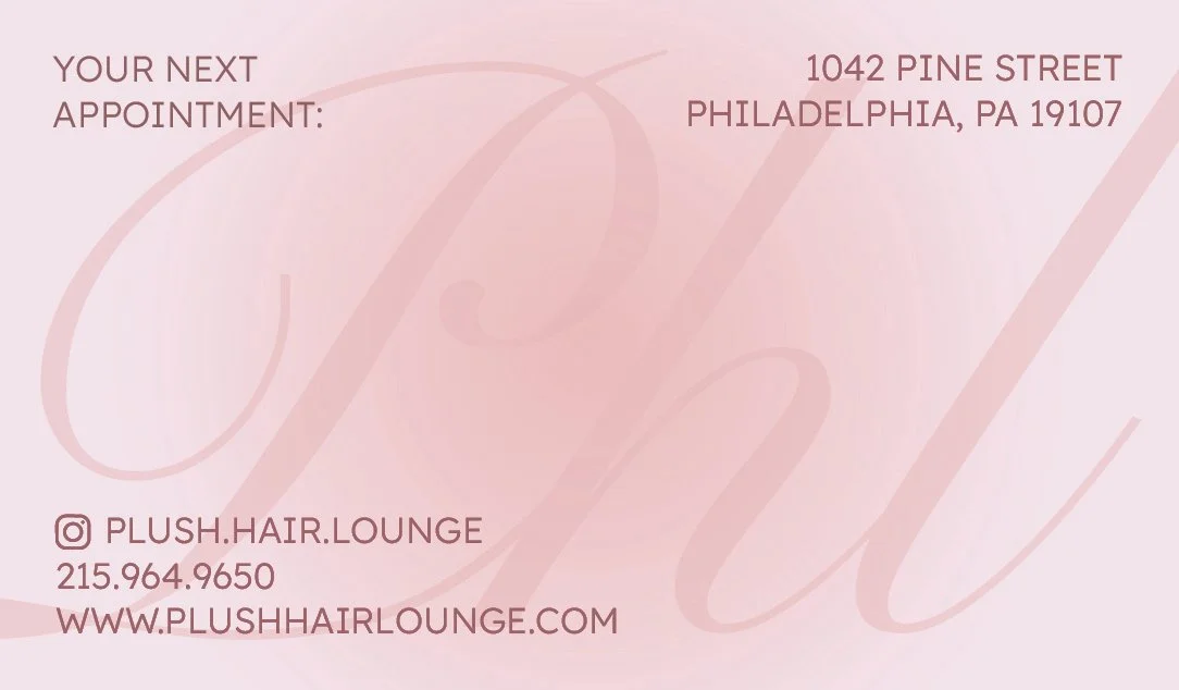 A new business card design for Plush Hair Lounge, a hair salon located in center city, Philadelphia. The owners wanted to keep the design elegant, minimal, and feminine.